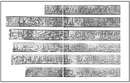 Yesevi külliyesinin kubbe kasnağı çerçevesinin üç yönünde devam eden ve En'am suresinin 59-63. ayetlerini içeren hat yazısı. |